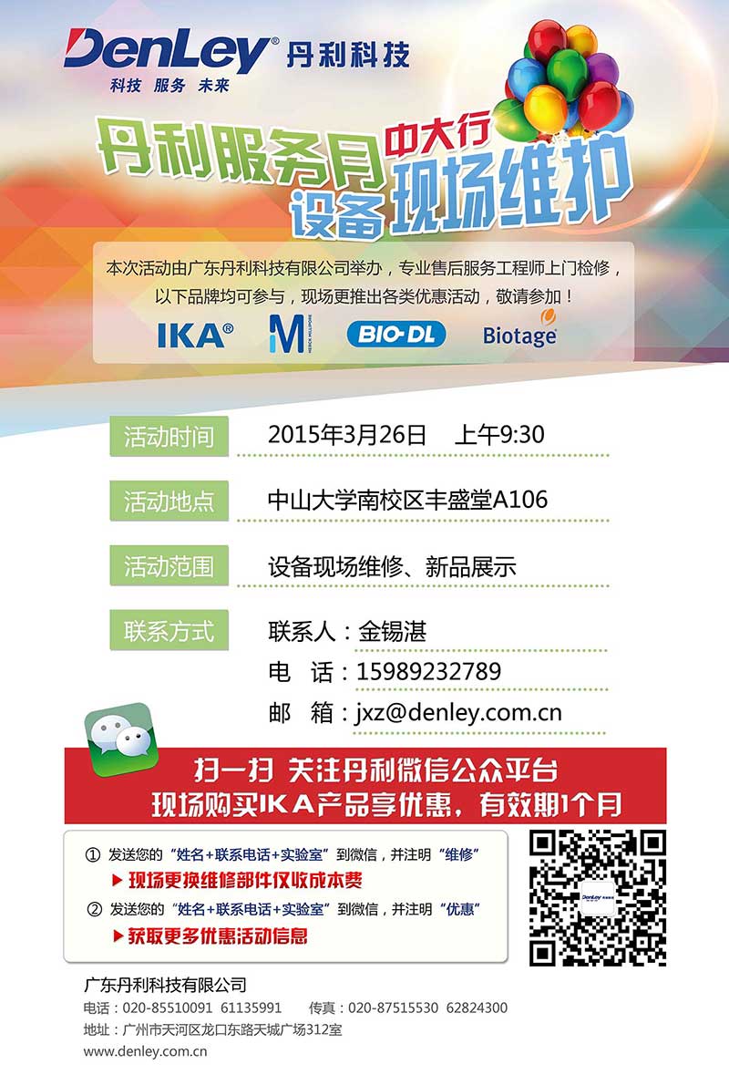 2015年3月26日上午9:30廣東丹利科技有限公司將在中山大學(xué)南校區(qū)豐盛堂A106室舉辦--丹利服務(wù)月 設(shè)備現(xiàn)場維護活動,專業(yè)售后服務(wù)工程師上門檢修,IKA、密理博、寶予德、Biotage等品牌均可參與,現(xiàn)場更推出各類優(yōu)惠活動,敬請參加!