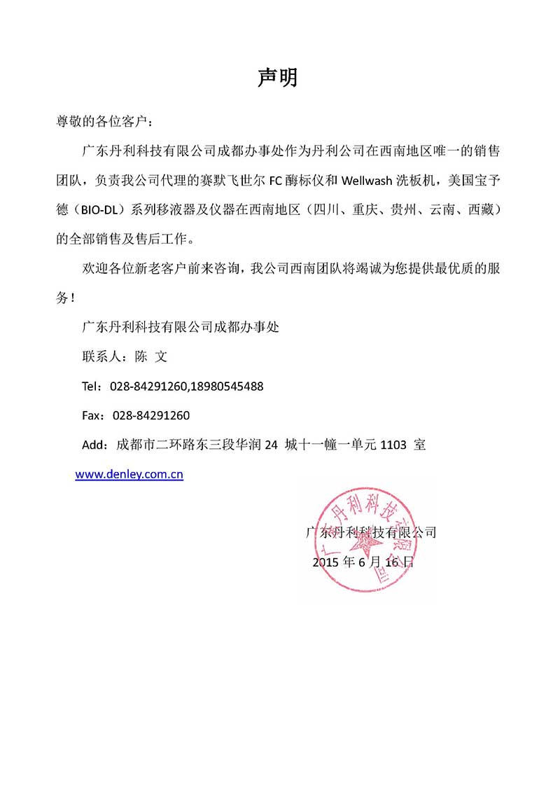 尊敬的各位客戶: 廣東丹利科技有限公司成都辦事處作為丹利公司在西南地區(qū)唯一的銷售團(tuán)隊(duì),負(fù)責(zé)我公司代理的賽默飛世爾FC酶標(biāo)儀和Wellwash洗板機(jī),美國(guó)寶予德(BIO-DL)系列移液器及儀器在西南地區(qū)(四川、重慶、貴州、云南、西藏)的全部銷售及售后工作。