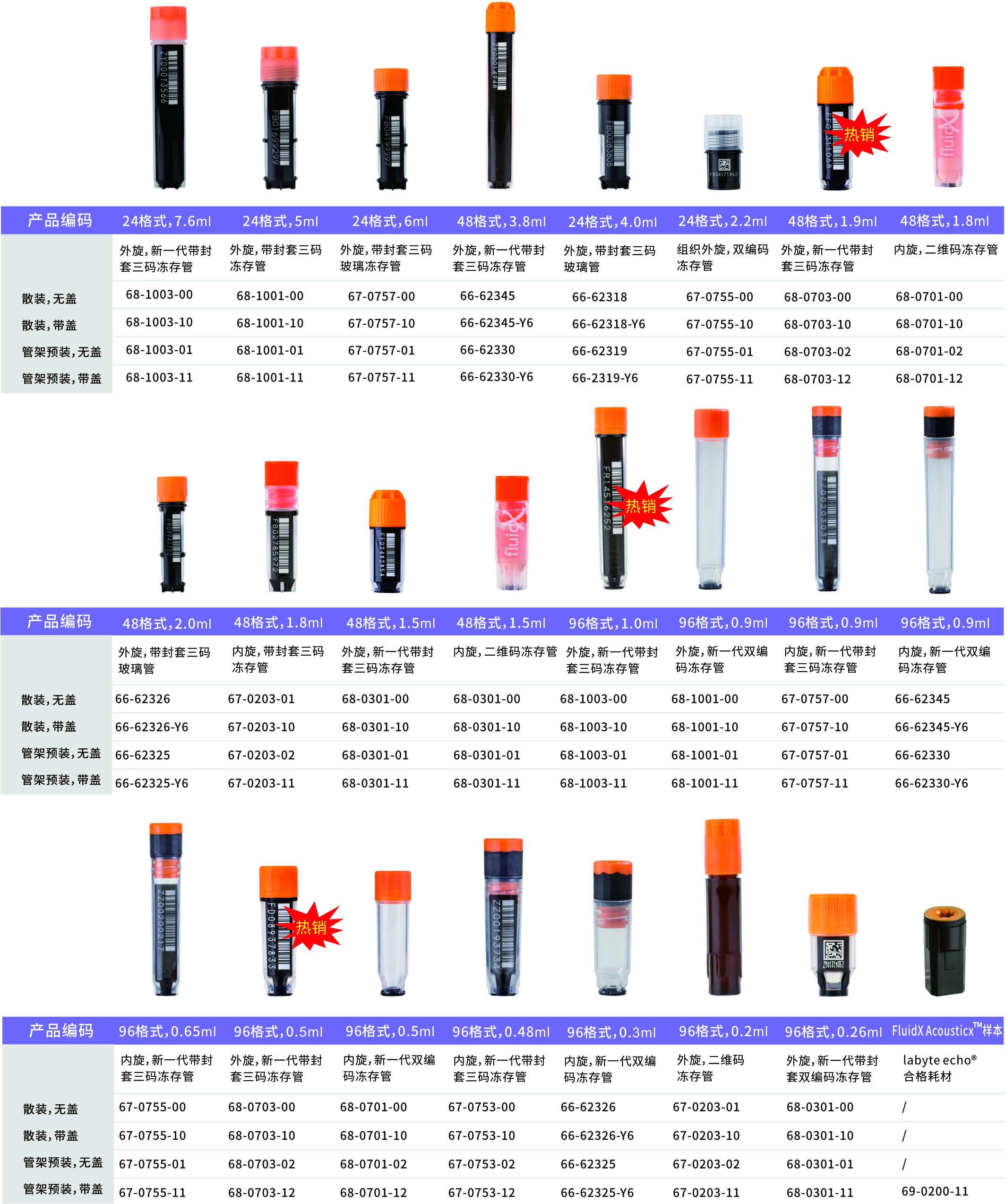 安升達(dá)凍存管有很多種格式,包括帶封套式、散裝式、有蓋式和無蓋式。我們強(qiáng)大的代碼管理系統(tǒng)確保每一個(gè)代碼都是永久性的、唯一的,并且永遠(yuǎn)不會(huì)重復(fù)。凍存管適用的使用范圍為+121℃至-196℃。